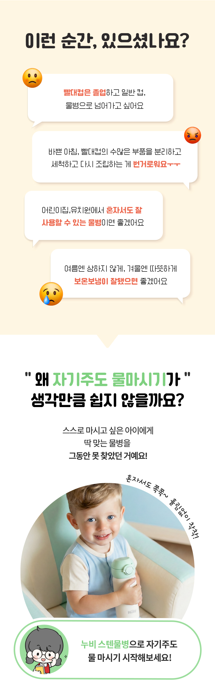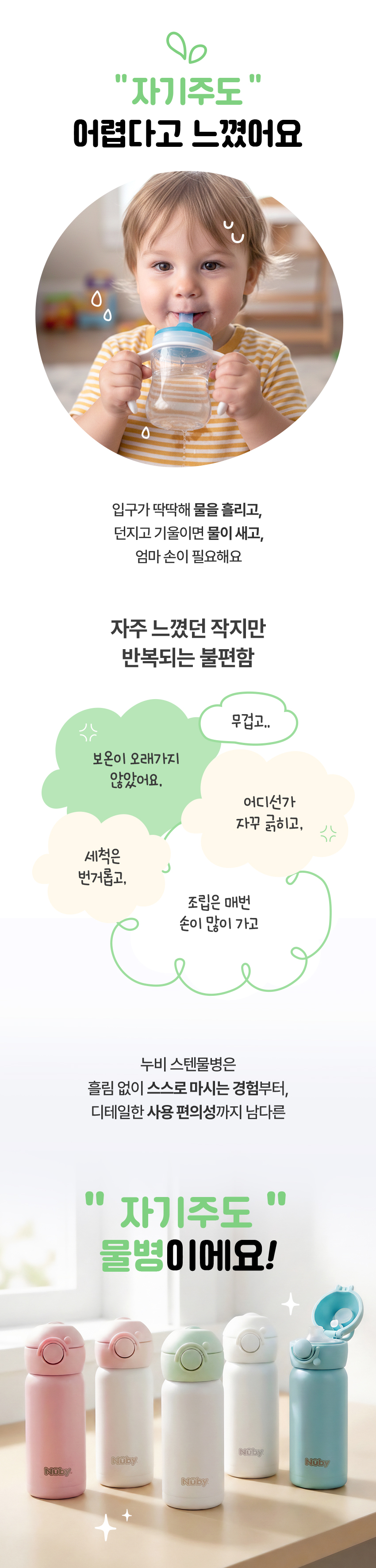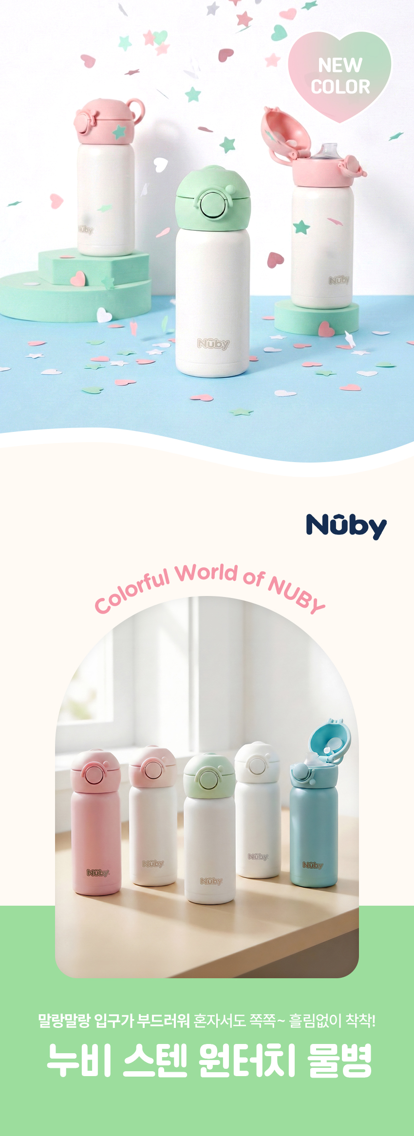 누비 원터치 스텐물병은 실리콘 주입구와 최소 부품 구조로 분리 세척과 관리가 간편한 유아 전용 보온·보냉 텀블러입니다.