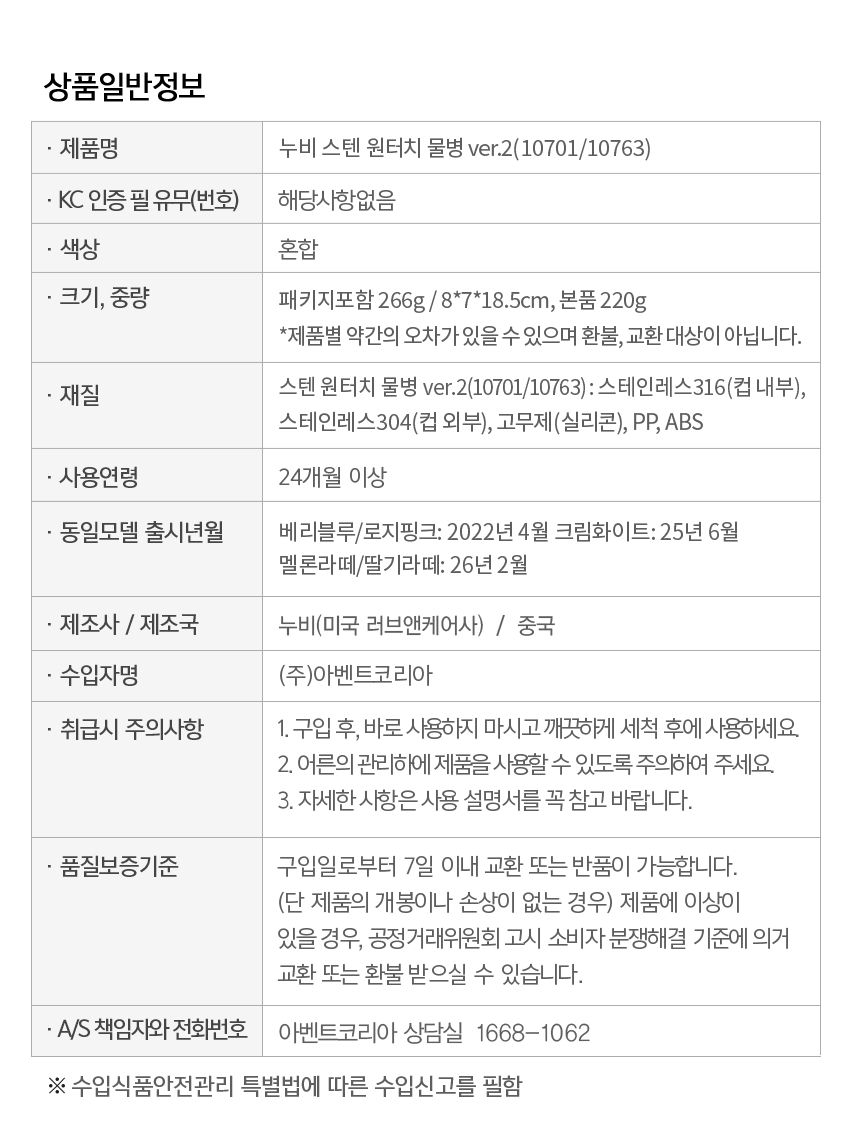 | 주입구 구조 | 실리콘 소재의 직입형 주입구 (빨대형 아님) |